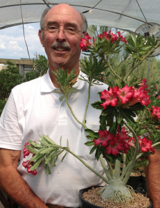 Mark’s other and ongoing career is as a plant breeder. He spent a couple of decades hybridizing Trichocereus (=Echinopsis, cacti), then Tillandsia (bromeliads); he has introduced about 50 cultivars. Since the late 1970s his main focus has been on hybridizing the genus Adenium; ‘Crimson Star’, ‘Evelyn Marie’, and ‘Bouquet’ are among his creations. He is coauthor of the book Adenium: Sculptural Elegance, Floral Extravagance (2008). Mark also collects and grows a number of other weird plants, mostly succulents and epiphytes.