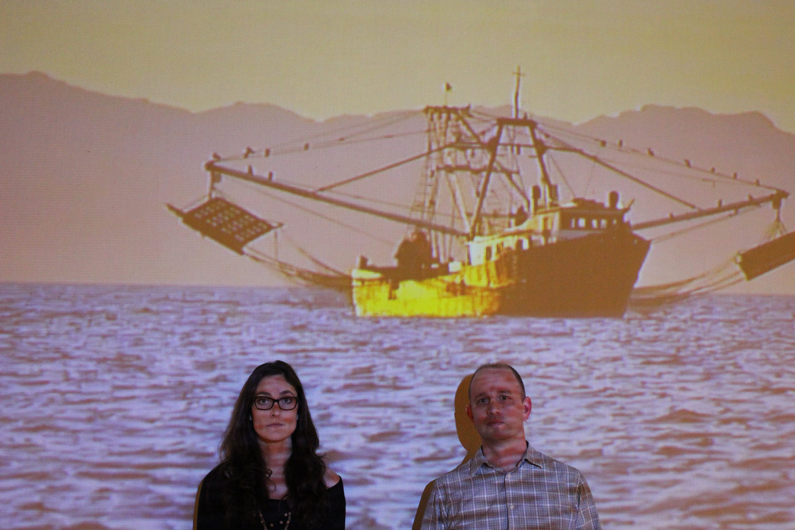 Johnson and Magrane in front of Bycatch video installation at University of Arizona Museum of Art, February 2017, courtesy of Maria Johnson and Eric Magrane; photo courtesy of Gina Compitello, University of Arizona Museum of Art
